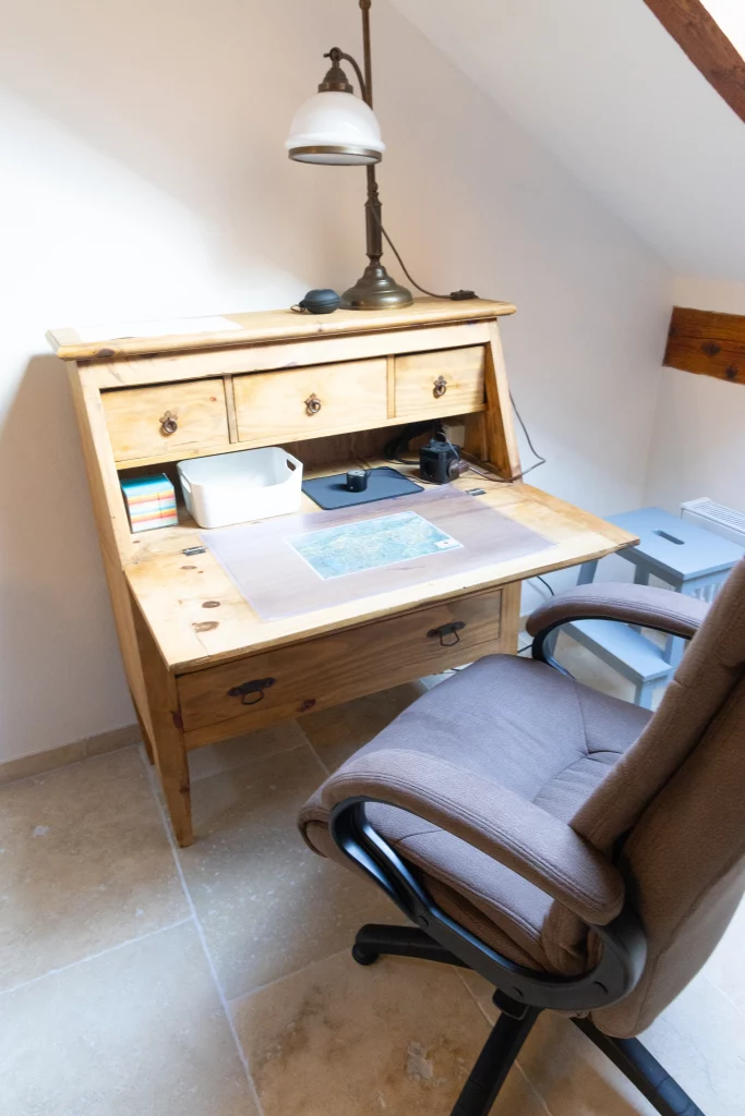 - Wohnbereich: Schlafsofa, Smart-TV, Sekretär, Schreibtischstuhl