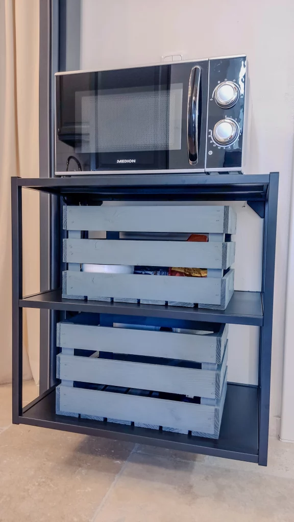 - Wohnküche: voll ausgestattete Küche mit Essbereich. Geräte (Herd, Backofen, Kühlschrank mit Gefrierfach, Geschirrspüler, Wasserkocher, Kaffeemaschine, Mikrowelle, Airfryer)