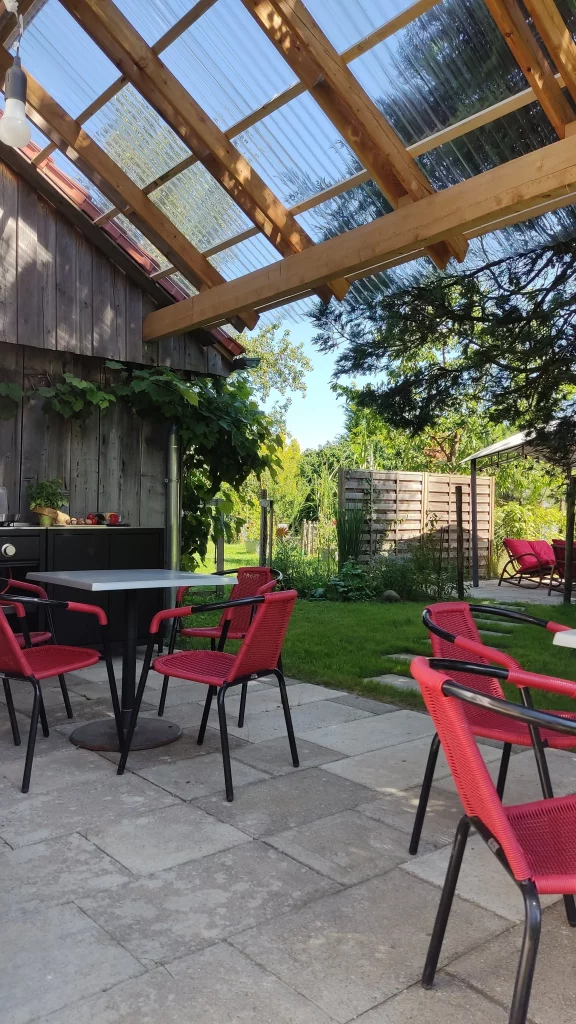 Im Außenbereich erwartet Sie ein gemütlicher Gästebereich, der perfekt zum Entspannen und Genießen einlädt. Der Pavillon und die überdachte Terrasse bieten Ihnen ein ideales Plätzchen, um die frische Luft zu genießen, zu grillen oder einfach die Seele baumeln zu lassen.